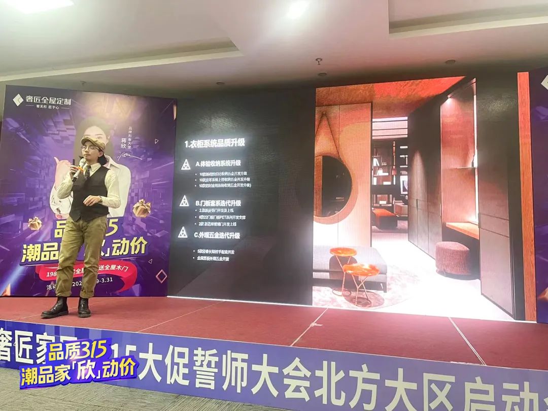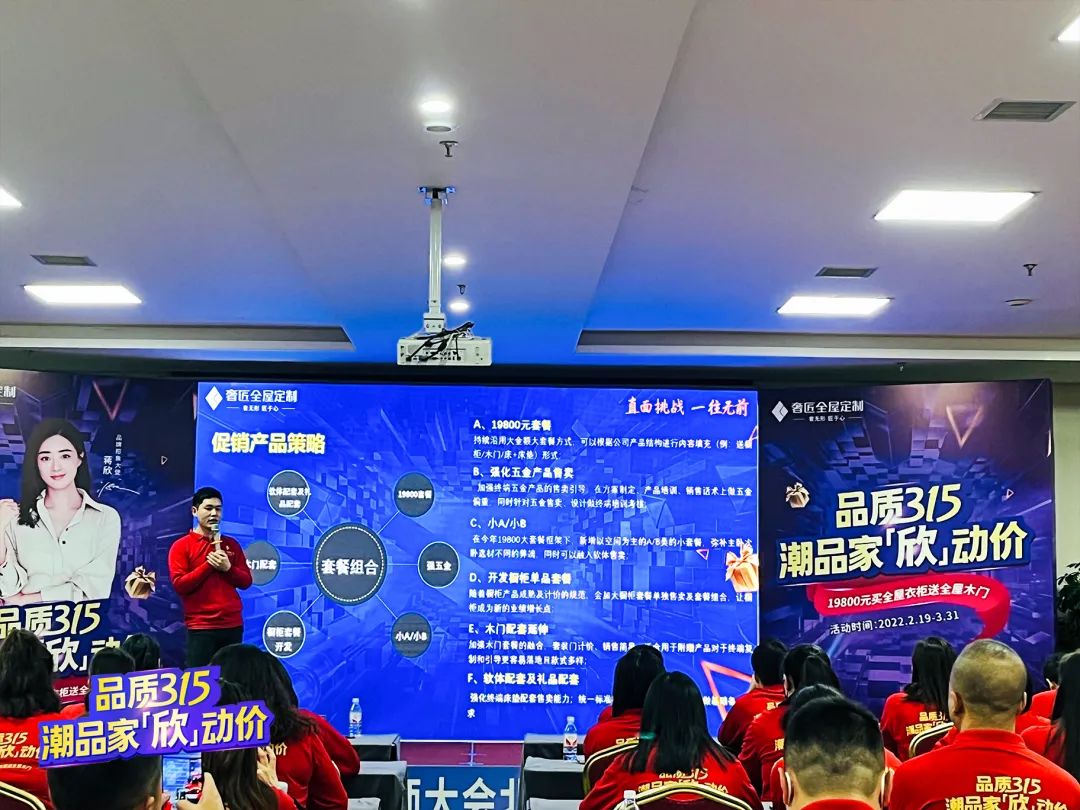 隨后,奢匠家居渠道總監(jiān)—夏飛先生代表公司首先對現(xiàn)場全員的到來表示歡迎,同時對2022年渠道部門重要戰(zhàn)略規(guī)劃進(jìn)行詳細(xì)部署。他表示:“2022年是奢匠的騰飛之年,也是渠道部門的關(guān)鍵之年。為促進(jìn)終端門店更迅速的搶占市場,實現(xiàn)渠道部全新突破,我們針對市場趨勢,從渠道提升、品牌戰(zhàn)略兩大方面制定了專項計劃。第一,我們將進(jìn)一步深化體系改革,聚焦定制,增強對終端的培訓(xùn),尋求新的業(yè)績增長點。第二,加大品牌投放力度,借勢熱點IP,簽約輪滑世界冠軍—郭丹作為全新顏質(zhì)品推官,強效賦能品牌及終端,助力此次315大促再獲佳績。”