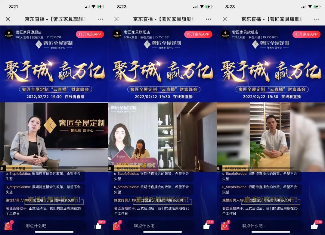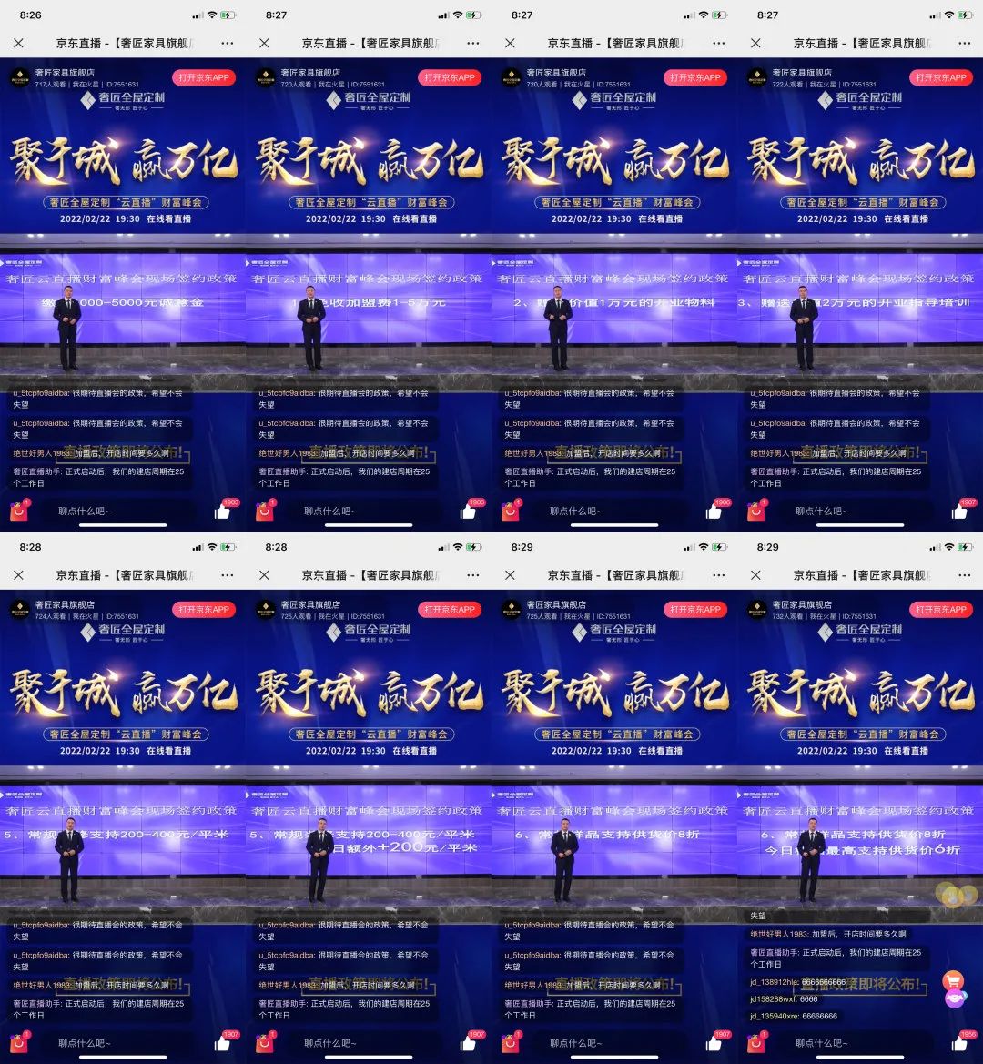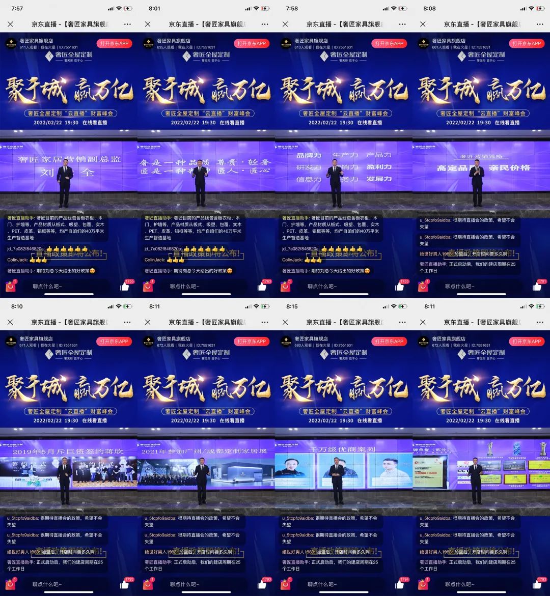 在此次云直播財富峰會上,一眾品牌經銷商為助力更多擁有財富夢的意向加盟者抓住機會,紛紛現身直播間親述了自己選擇加盟奢匠的理由。并對奢匠此次云直播財富峰會的舉辦表示祝賀!