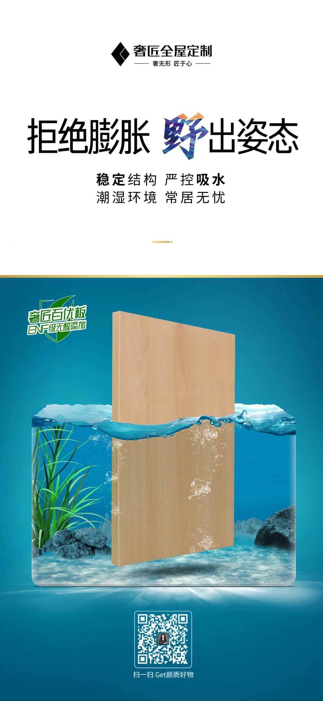 奢匠百優(yōu)板擁有優(yōu)越防潮性能,吸水膨脹率僅為3%,在長(zhǎng)久處于潮濕環(huán)境之下,也可嚴(yán)防死守保持性能穩(wěn)定。