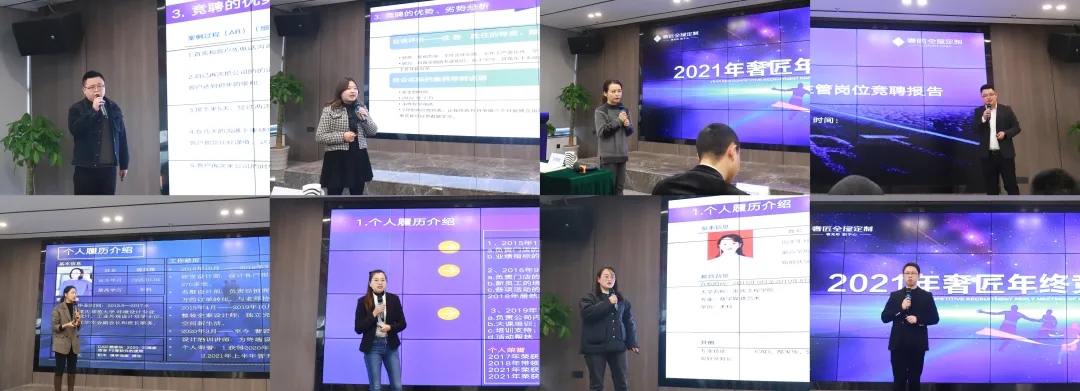 為進(jìn)一步完善公司內(nèi)部人才梯隊建設(shè),為優(yōu)秀員工搭建施展才華的平臺,2022年1月10日下午,奢匠2021年度競聘答辯會在總部營銷中心拉開帷幕。本次崗位競聘經(jīng)過前期資格審查、綜合評測等一系列流程后,最終來自總部各部門八名人員脫穎而出進(jìn)入到現(xiàn)場競聘環(huán)節(jié)。