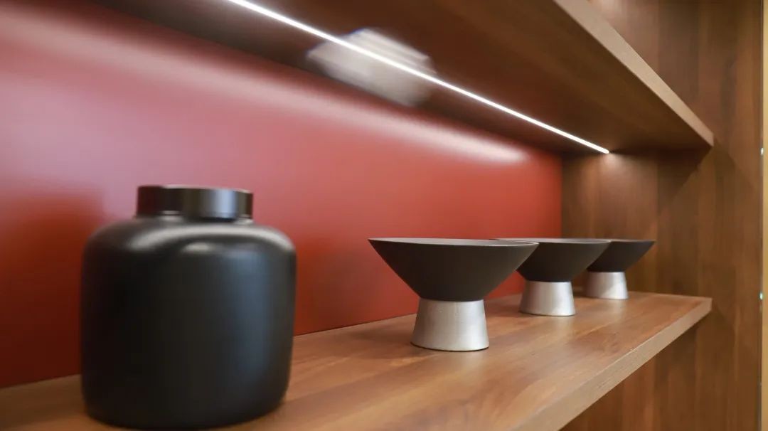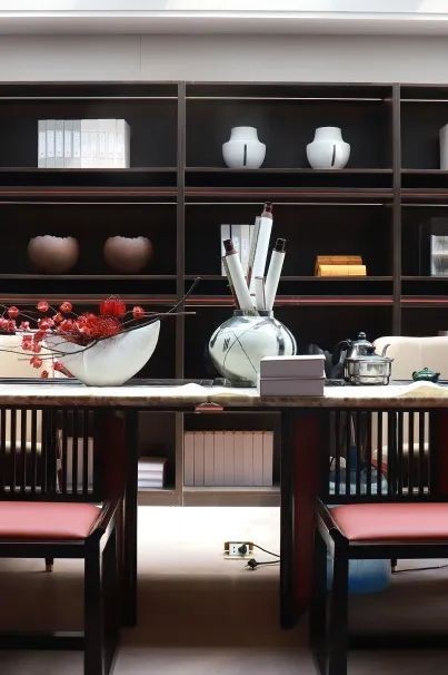 中式風格講究綱常與對稱,通排大氣的開放式柜體,大開大合彰顯著中式傳統(tǒng)文化的包容與氣度,豇豆紅的跳躍中和黑檀木的沉穩(wěn)厚重之感,東方意蘊的色調(diào)和以“簡”為道的設計,讓空間格局時尚又不失穩(wěn)重。