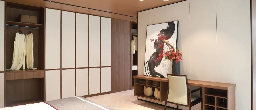 景中有境,境由心生。臥室的細節(jié)處理也頗具巧思,整體設計延續(xù)客廳布紋色與黑檀木色的搭配,清爽明亮。開放式衣柜與封閉式衣柜的搭配布局設計,讓整個空間層次分明,不張揚卻又不失格調(diào)。