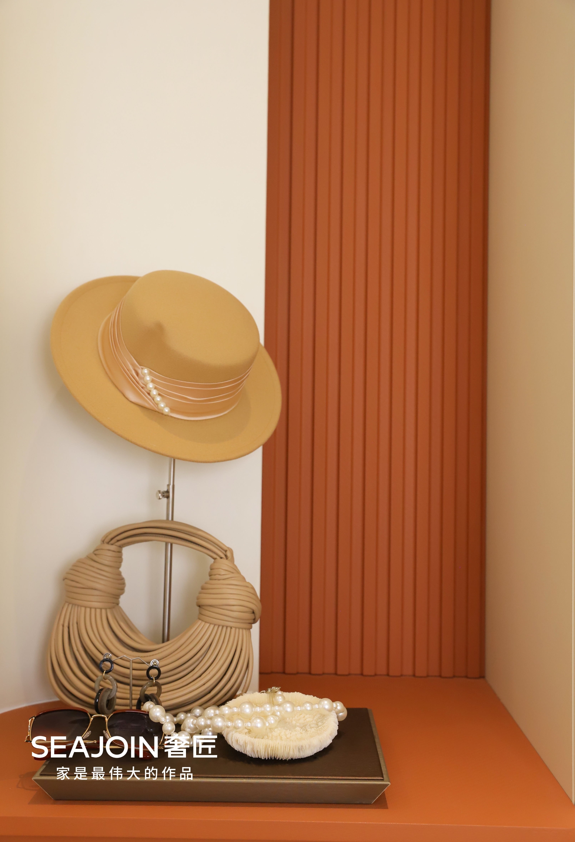 打開通透且有質(zhì)感的玻璃門就是衣帽間,在這里材質(zhì)、工藝、色彩相互碰撞融合。