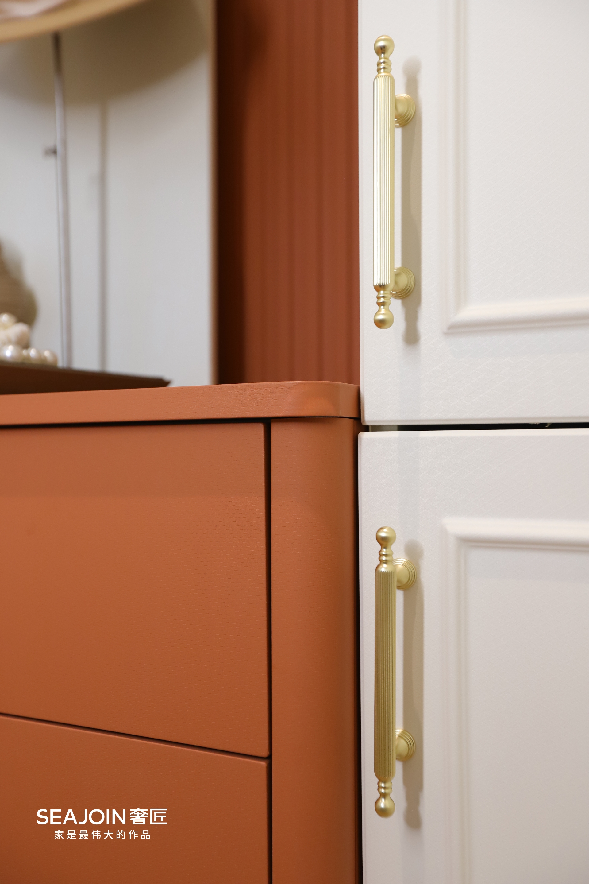 在混油工藝極致的色彩把控力下,奶油色系空間內(nèi)的這抹鮮艷明媚色彩,跳躍出一抹驚艷人眼眸的活力。與法式線條相融,增加空間層次感。