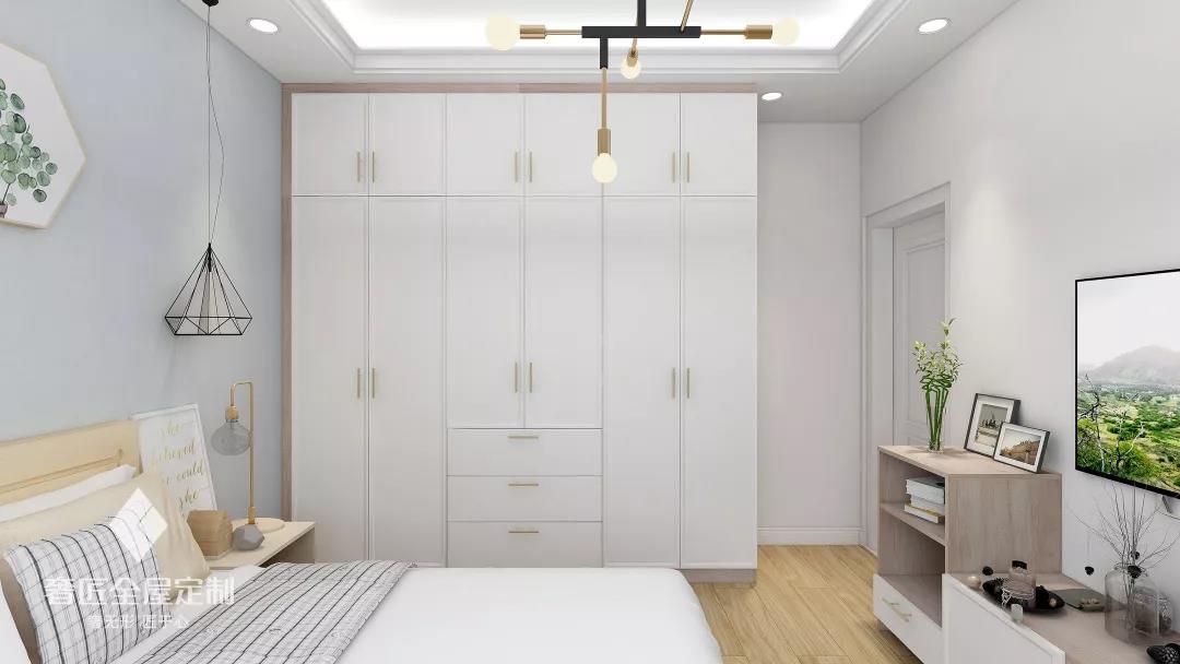 不同的材質(zhì)與不同的色彩搭配,能夠營造不同的感覺,將臥室家具以同一種色調(diào)展現(xiàn)出來,產(chǎn)生一種與眾不同的效果。白色背景墻、白色置頂衣柜以及白色棉質(zhì)床品,以純粹的白色塑造了統(tǒng)一的視覺效果,效果渾然一體,房間透亮不顯雜亂,有效地起到延展空間的作用。