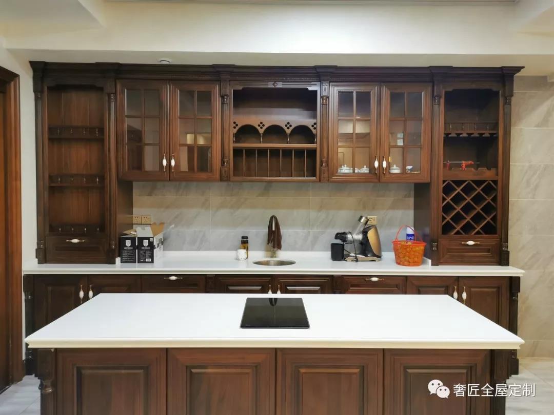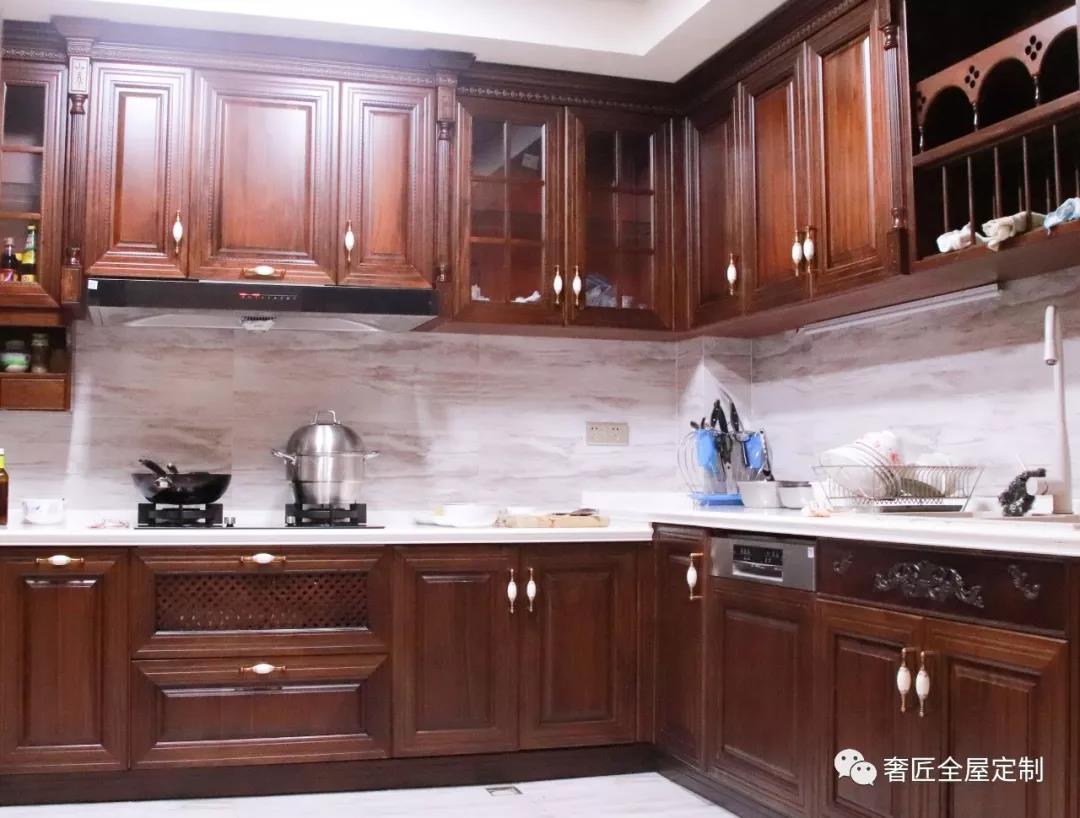 廚房的廚柜材質(zhì)運(yùn)用實(shí)木,搭配上廚房極具現(xiàn)代化的器具用品,形成從洗菜、切菜、炒菜的流暢動(dòng)線。棕色的廚柜,色彩上給人溫馨的感覺,大理石臺面與廚柜巧妙的融合及兼顧使用的設(shè)計(jì),讓廚房在使用過程中更加舒適便利。