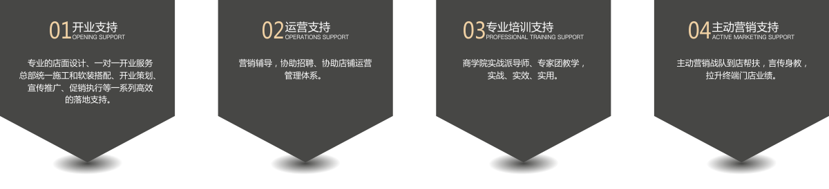 統(tǒng)一的VI、SI形象系統(tǒng),統(tǒng)一的店鋪運(yùn)營(yíng)管理體系,統(tǒng)一的培訓(xùn)支持體系,統(tǒng)一的廣告宣傳及活動(dòng)推廣支持,強(qiáng)大的直營(yíng)樣板市場(chǎng)及運(yùn)營(yíng)支持團(tuán)隊(duì),專業(yè)的終端活動(dòng)實(shí)地幫扶支持。