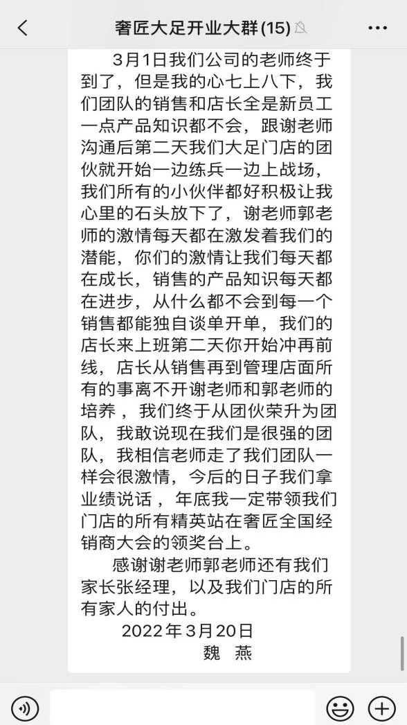 在活動(dòng)期間,為了促進(jìn)大足團(tuán)隊(duì)的快速成長,主動(dòng)營銷謝老師專門建立“品質(zhì)315大促開業(yè)活動(dòng)群”。并規(guī)定,店內(nèi)成員都需將當(dāng)天的工作成果與心得在群內(nèi)進(jìn)行發(fā)布,達(dá)到相互督促,相互成長的目的。