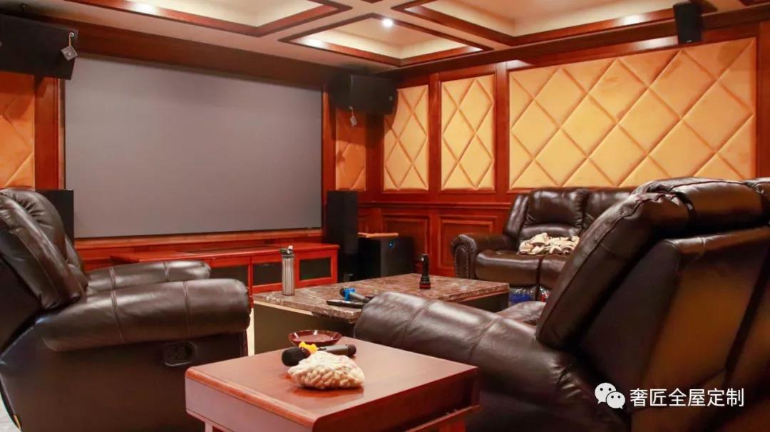 在家設(shè)影視廳,平時可作家用電影院,亦是獨立K歌房,位置設(shè)在負一樓,自帶隔音效果,完全不用擔心吵到家人休息。影視廳整體以深棕為基調(diào),背景墻采用軟包設(shè)計,搭配黑色皮質(zhì)沙發(fā)作為局部點綴,將富有古韻的胡桃木與時尚軟裝家居完美結(jié)合,打造視覺上的平衡感,以此演繹大氣典雅的東方韻味。