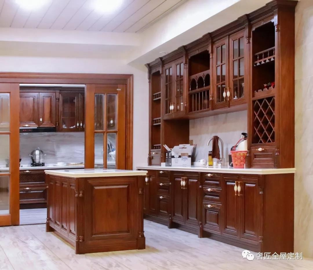 廚房的廚柜材質(zhì)運用實木,搭配上廚房極具現(xiàn)代化的器具用品,形成從洗菜、切菜、炒菜的流暢動線。棕色的廚柜,色彩上給人溫馨的感覺,大理石臺面與廚柜巧妙的融合及兼顧使用的設(shè)計,讓廚房在使用過程中更加舒適便利。