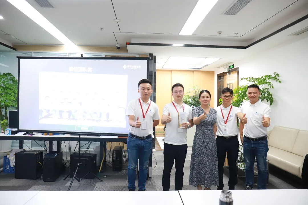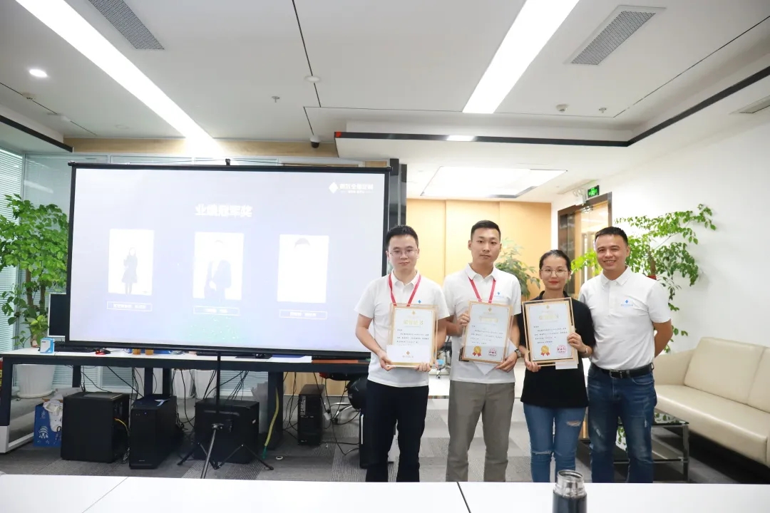 研發(fā)部經(jīng)理梁華波先生(右一)為主動營銷部黃飛(代領(lǐng))、直營部曾宏洋、招商部牟治林頒獎