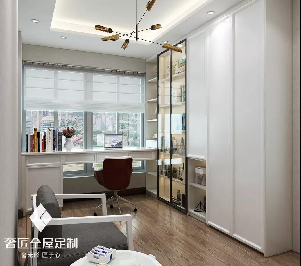 書房設(shè)計(jì)簡潔舒適,不添一絲冗雜物品。一柜到頂整墻式書柜格外惹眼,玻璃門的設(shè)計(jì)讓柜中擺設(shè)盡入人眼,簡約中透著大氣,更多的收納空間讓藏書更加隨心所欲。依窗而設(shè)的書桌,線條也極為簡單,處處展現(xiàn)隨性的美感,與高大書柜連接一體,巧妙的布局既節(jié)省了空間,亦使空間更加寬敞明亮。書房每個細(xì)節(jié)都是設(shè)計(jì)師深思熟慮后的杰作,完美呈現(xiàn)現(xiàn)代簡約的特點(diǎn)。