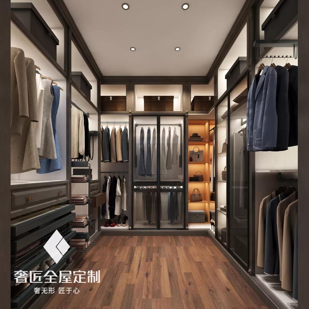 輕奢衣帽間整體設(shè)計給人一種非常放松的體驗,沒有過多的炫耀式的裝飾,在簡約的空間里,通過材質(zhì)、色彩的運用,將輕奢風(fēng)打造得淋漓盡致。把衣物、包包放在一個專門的區(qū)域分類收納,讓家居變得干凈整潔,滿足對家舒適與品質(zhì)的雙重需求。